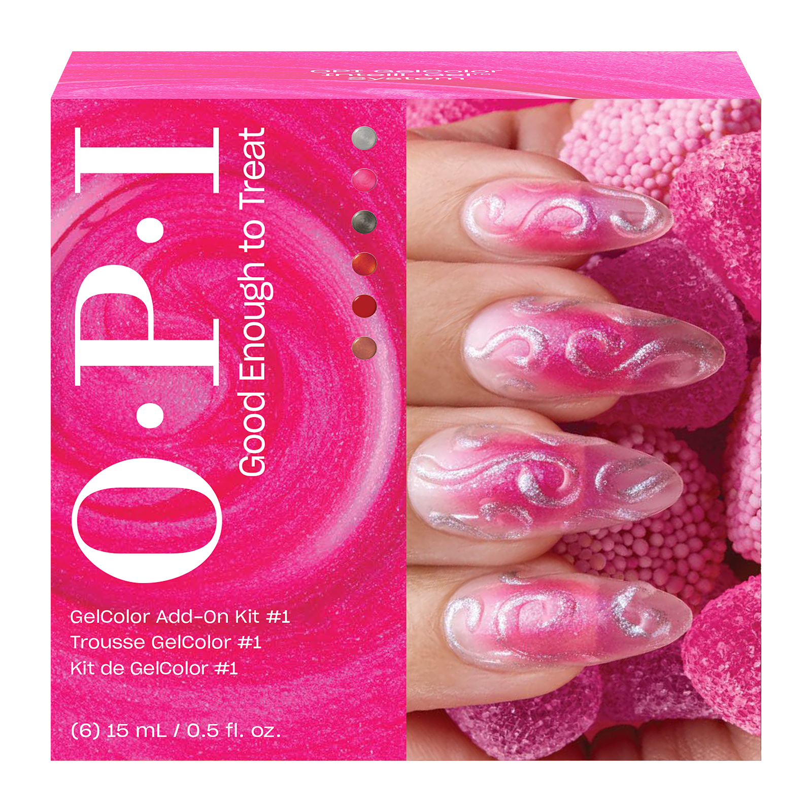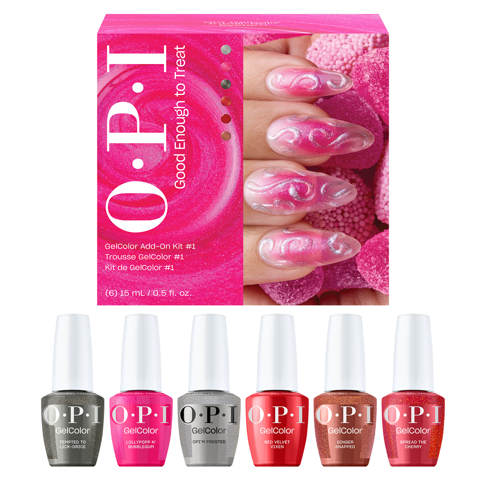 A limited edition collection of candied cremes and sugary shimmers that'll have your mani lookin' good enough to treat.  Includes: 6 - GelColor 15 mL - 0.5 Fl. Oz. Bottles, 1 - Blank Clear Color Palette with Chain and Label, 1 - Table Top Instructions